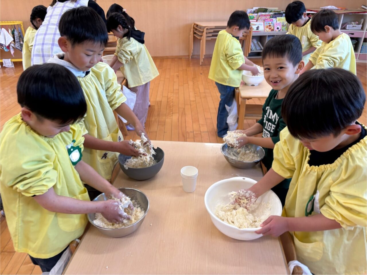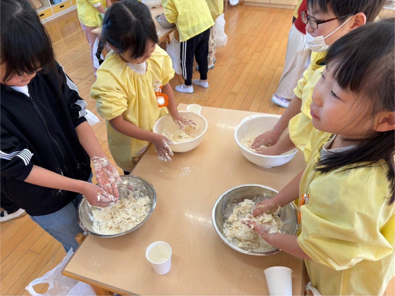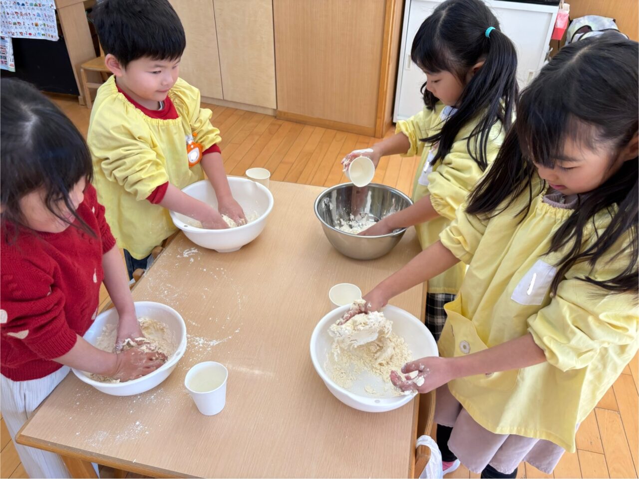 年長組は、小麦粉に自分で水と油を入れてこねました。