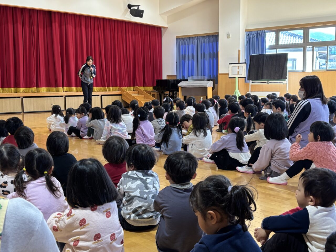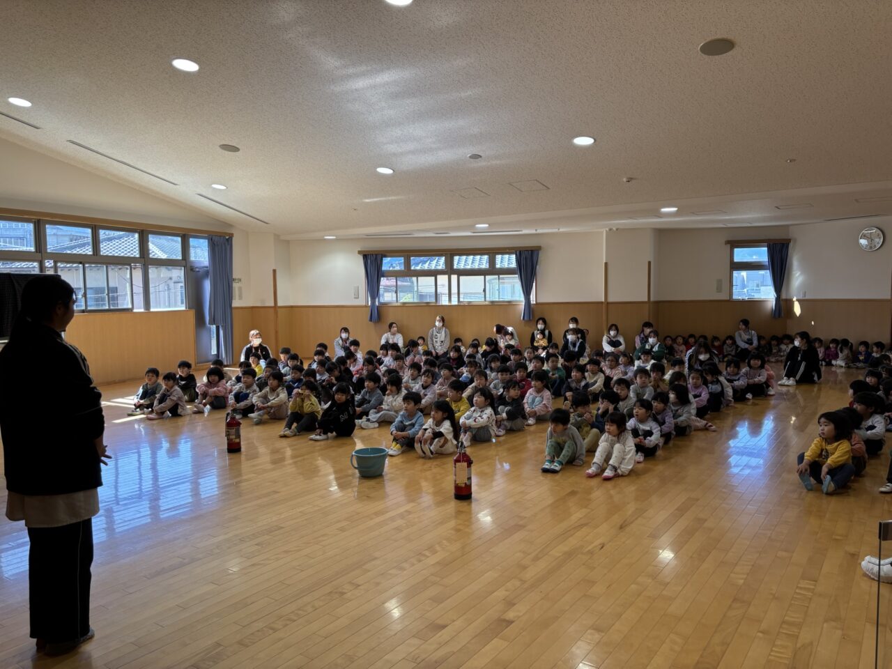 今年度、最後の避難訓練は、全園児サロンホールに集まりました!