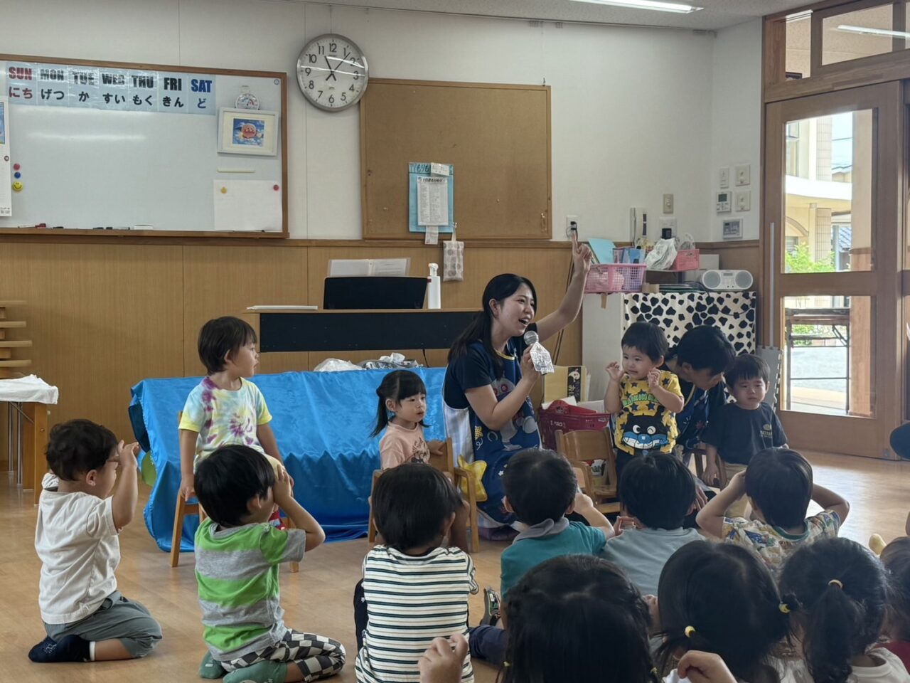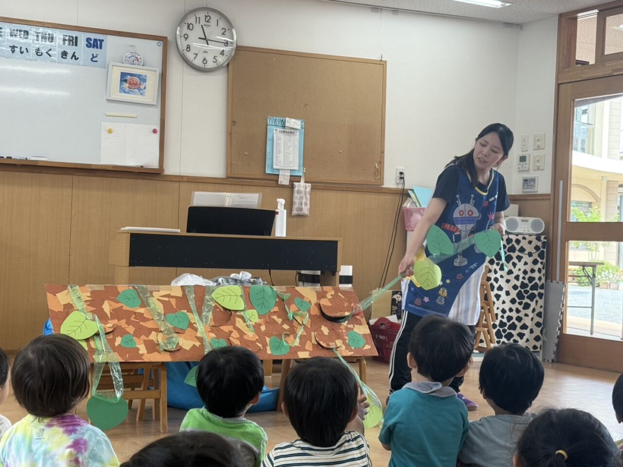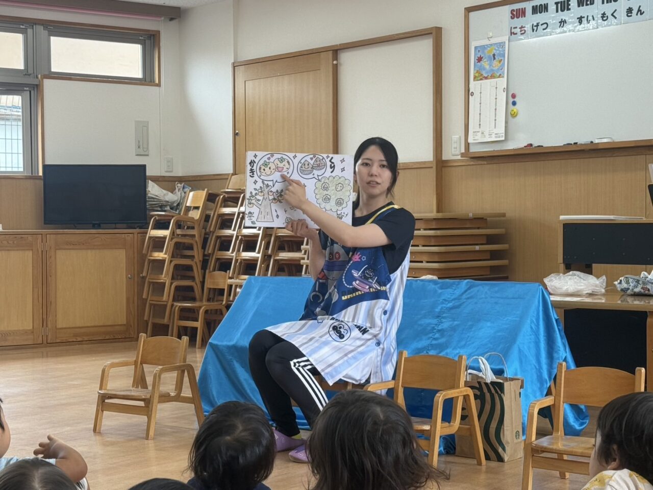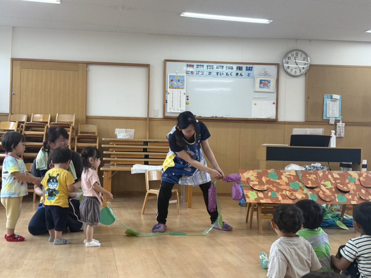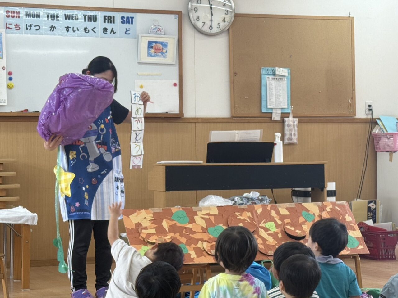 続いて0〜2歳児のお友だちの10月のお話しでは、本物の柿や栗も見ました!